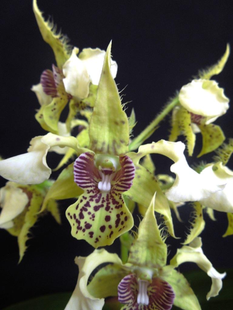 11 Inflorescences 46 flowers & 16 Buds Relevant 115mm 6 flowers. Petals- White NN155D All Sepals- Yellow/Green 150D, Labellum- Yellow/green 150D with stripes of Red/Purple 74D