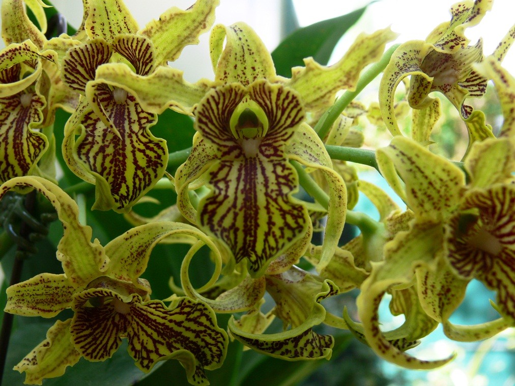 View on AOC website ↗3 inflorescences of 465mm with 61 flowers (23 relevant); petals and sepals Base colour yellow green 154C with markings of greyed purple 178A; labellum Base colour of distal end yellow 13A, base colour of centre white NN155D. Markings in greyed purple 178A over entire labellum.
