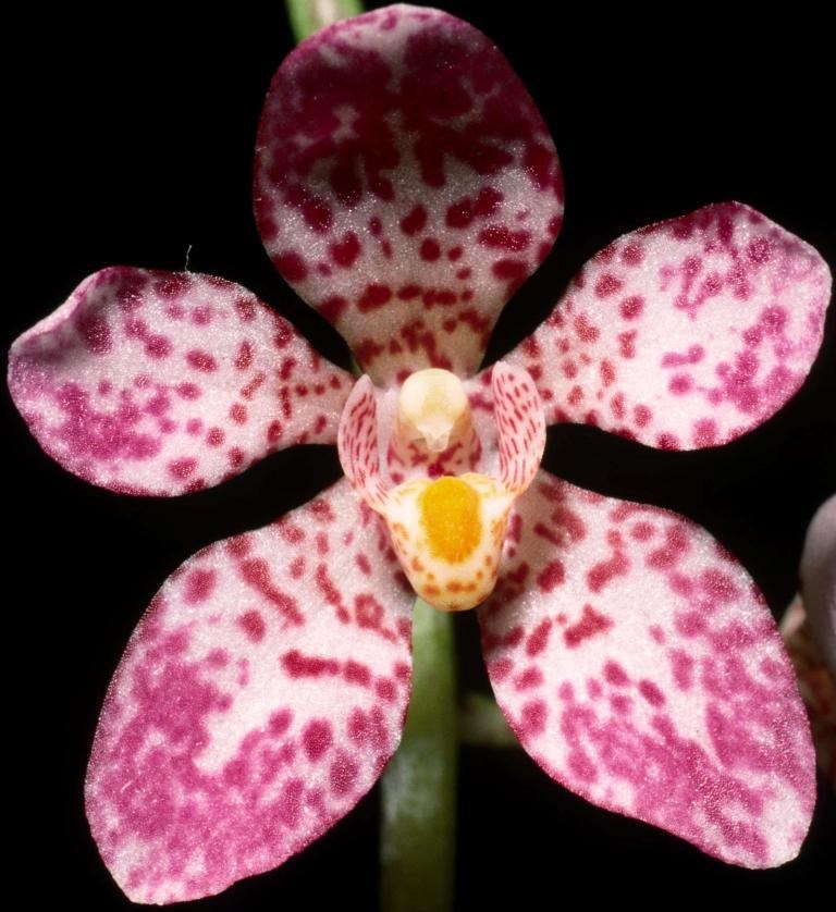View on AOC website ↗Petals and sepals red purple group 68C on white group 155C. Labellum staminode yellow group 9C. Considered to be an outstanding form of this species with extraordinarily good colour. AJ.