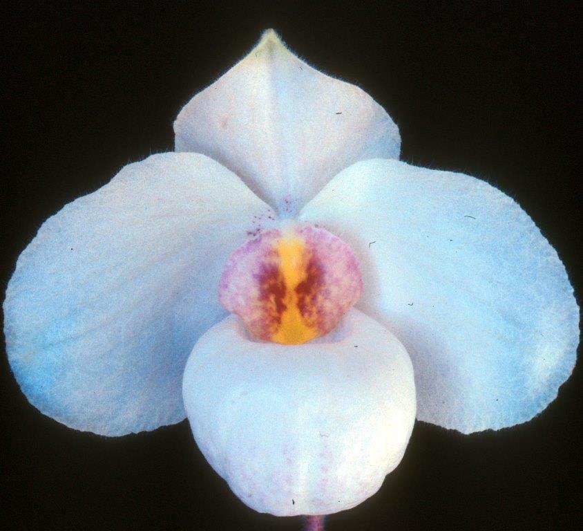 View on AOC website β1 inflorescence of 232mm with 1 flower; petals and sepals White NN155C with flush of Purple 76D; labellum Base White NN155C overlaid with Purple 75A. Staminode Yellow 3B and Purple