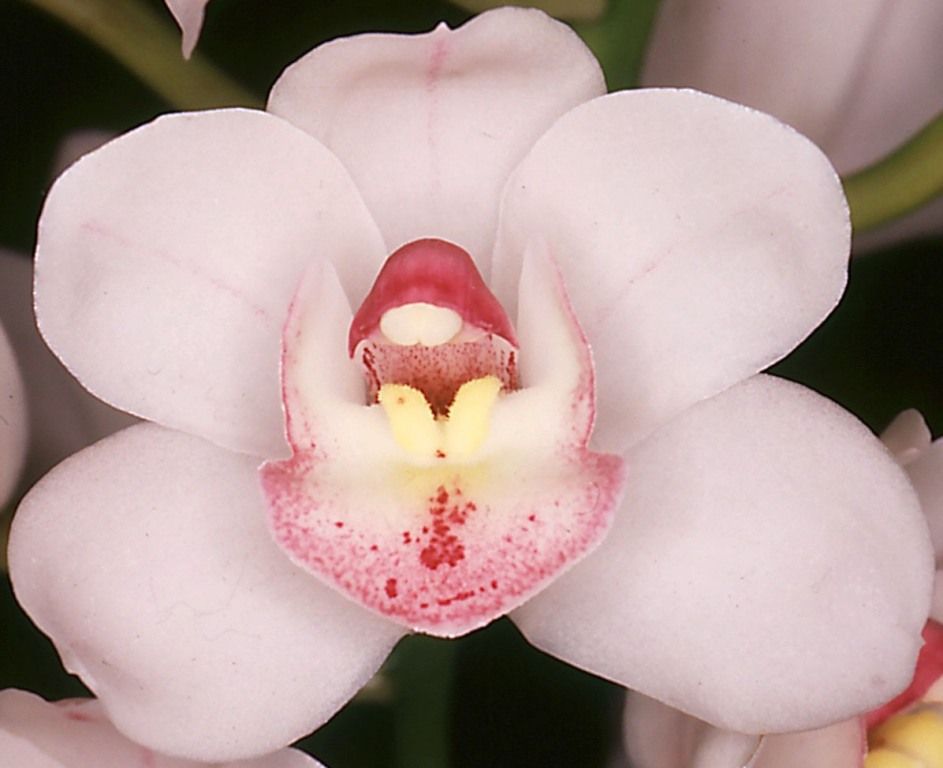 Segments white 155C. Labelllum background red 55C, striped red 46A.