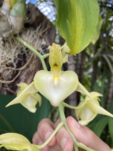 2 inflorescences flower count 26 + 26 buds relevant 26 + 6 buds length 290mm, All segments base colour Yellow/Green 145A with fine veining of Yellow/Green 144B. Labellum Throat Yellow/Orange 23A Fading to Green/Yellow 2B surrounding Centre then shading to Green/yellow 2A at outer edge. pendulous inflorescence displaying flowers well. Firm Substance, waxy texture