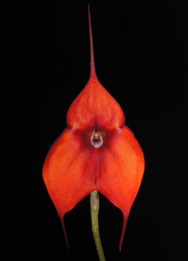 Dorsal red 45B. Lateral sepals orange-red 32A. Caudae 42A. Labellum black 202A. One flower. Stem 198mm.