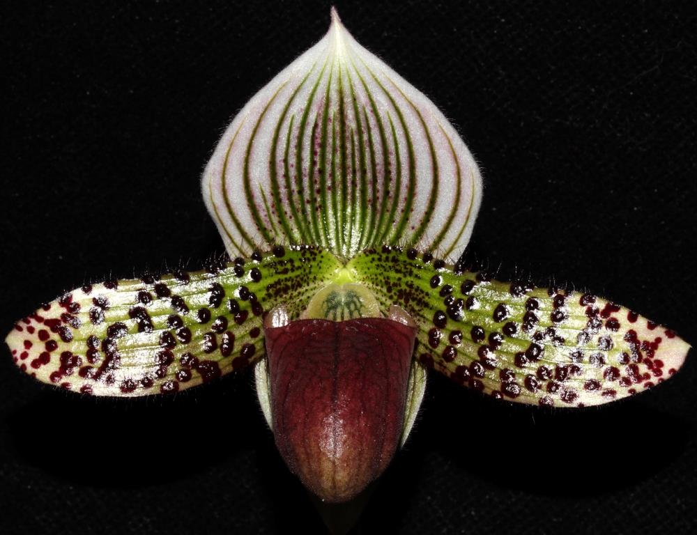 Petals green 138C in centre fading to green 138D to white 155A at ends. Dorsal sepal white 155C centrallly suffused green 142A overalid be veins red-purple 59A with green 142C at distal end. Ventral sepal green 138C fading to green 158D to white 155A, veined alternately red-purple 59A and green 138C. Labellum red-purple at centre, fading through 59B to 59C, then yellow-green 145C, veined yellow-green 145B. One flower on 230mm stem.