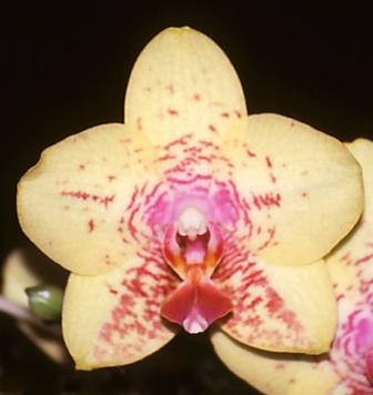 View on AOC website ↗Segments yellow-green 154B with red-purple 72 (base). Striped & marked red-purple 71B & 72D. Labellum red-purple 72A with yellow-orange 22A (centre). One inflorescence; 5 flowers. Stem 550mm.