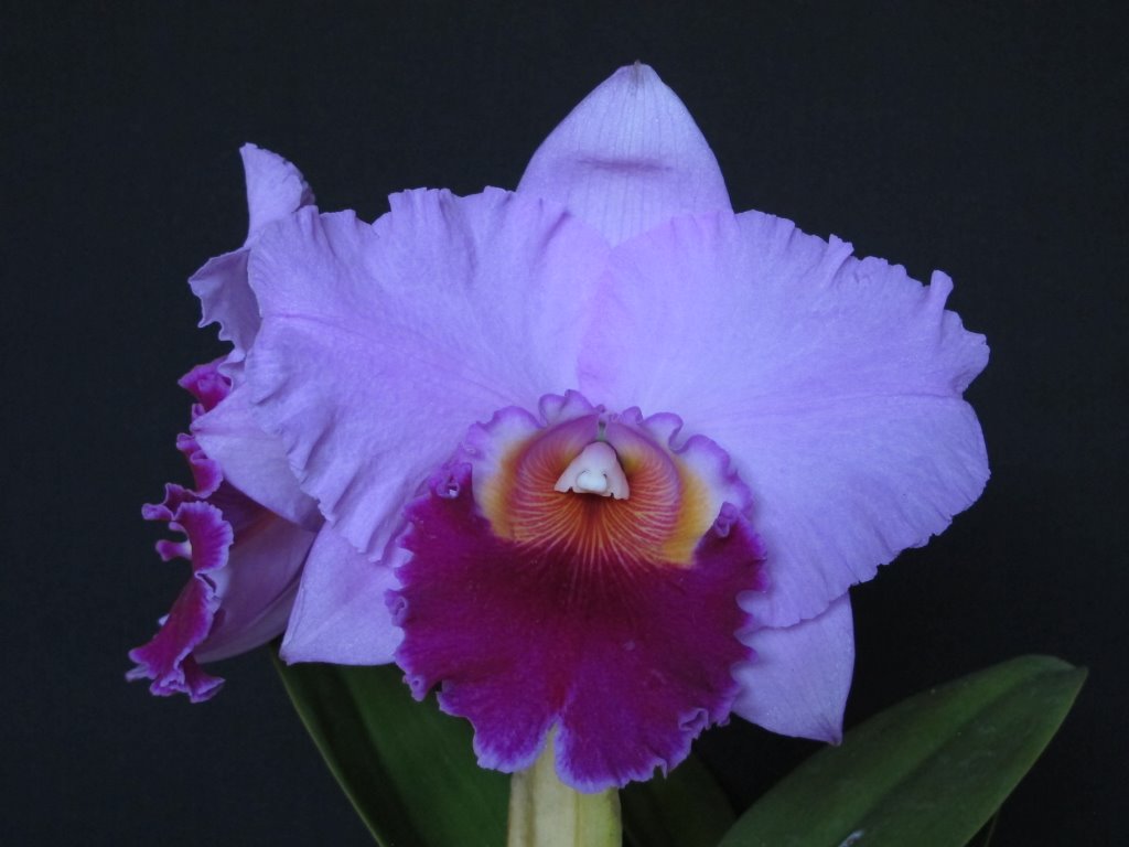 Petals red-purple 69C edged purple-violet 81C. Sepals purple-violet 81D. Labellum purple-violet 81B edged purple-violet 81C. Throat yellow 3C. One flower.