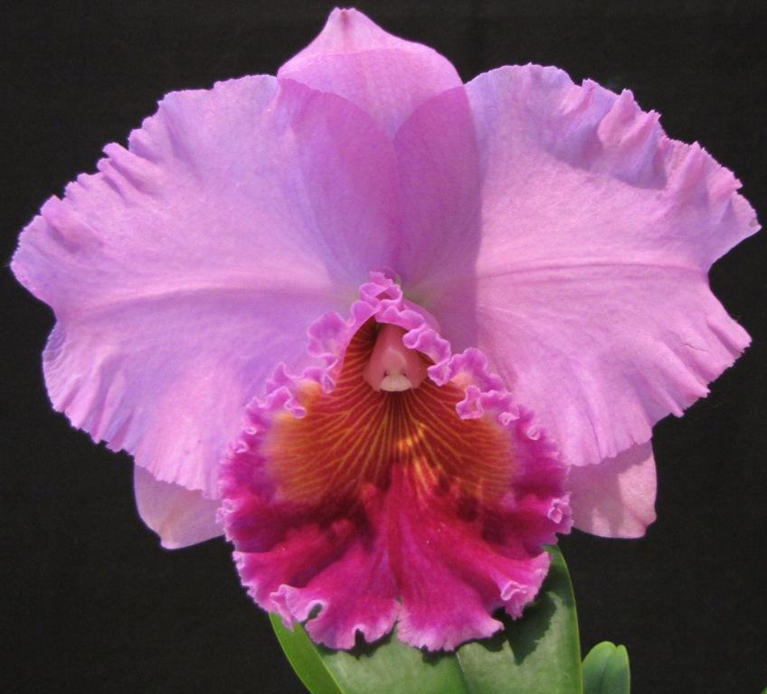 View on AOC website ↗Segments red-purple 81C. Labellum red-purple 74A throat yellow-orange 14, veined red-purple 74A. One flower. Stem 76mm.