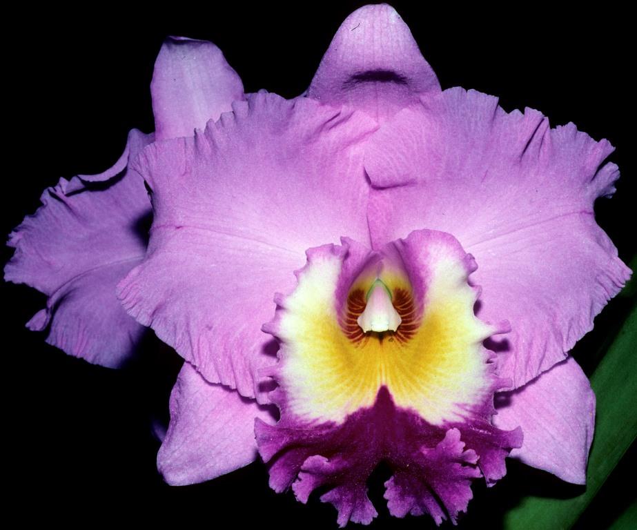 View on AOC website ↗Petals purple group 75C to 75D. Dorsal sepal purple group 75D. Labellum purple group 75A to 75C with yellow orange group 20B in centre. Classic Cattleya, well presented and displayed.