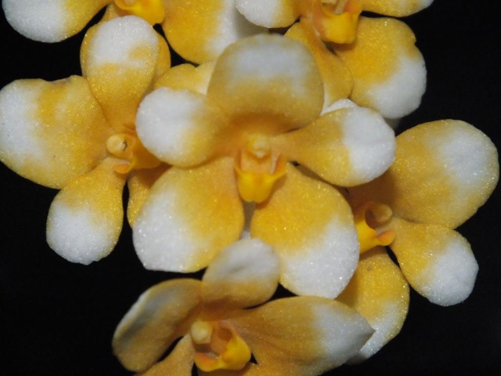 Segments white 155D, yellow-orange 17B at centre. Labellum yellow-orange 17B. One inflorescence 7 flowers/ 1 bud. Stem 170mm