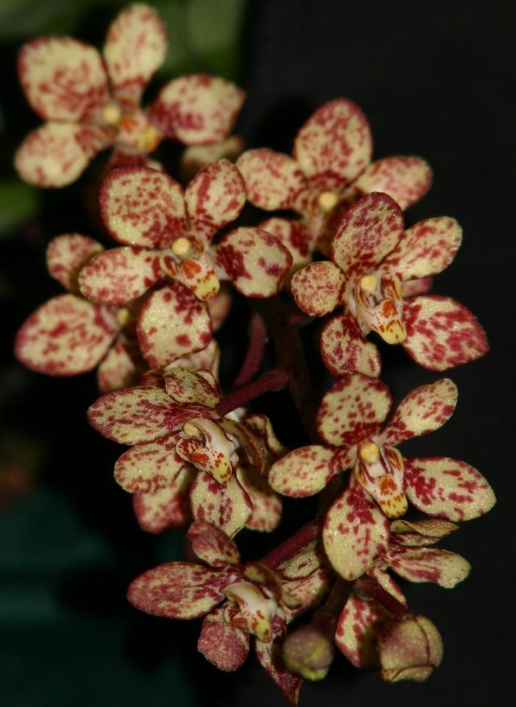 View on AOC website ↗All segments white 155C at centre, blotched & spotted orange-red 32B. Labellum white. Two hundren & ten inflorescences, 18 flowers on main one. Total 3780 flowers. Stems 200mm.