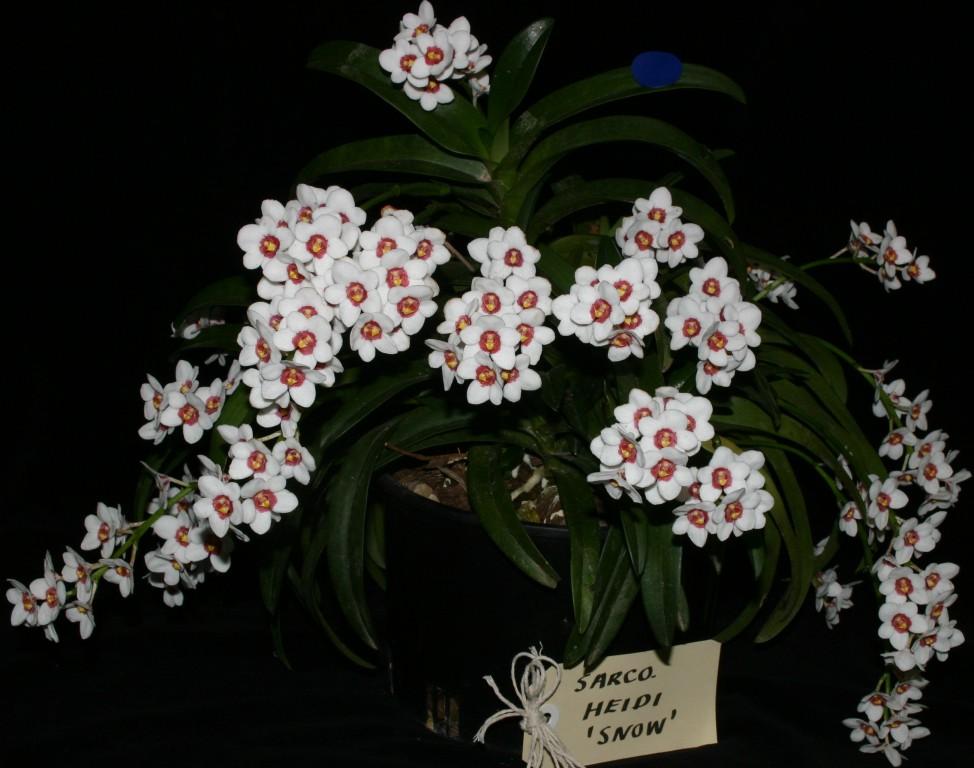 View on AOC website ↗Segments white, centre red-purple 71C. Labellum white centre yellow 7A. Thirty six inflorescences, 18 flowers on main oe. T otal 578 flowers. Stems 300mm.