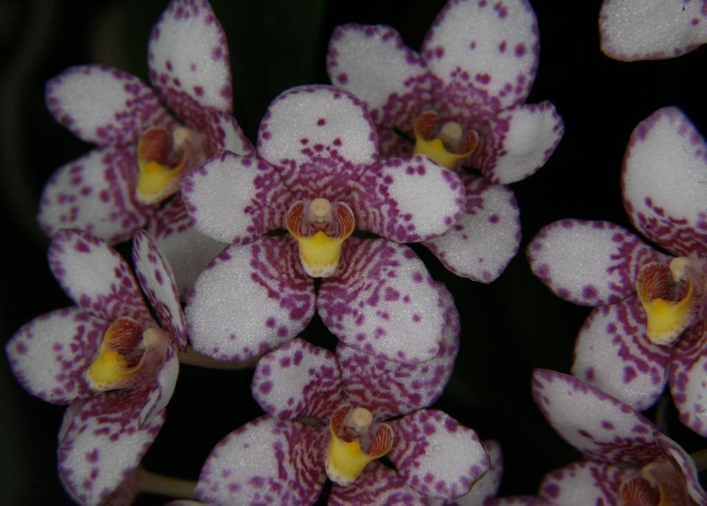 View on AOC website ↗25 inflorescences of 160mm with 404 flowers and 41 buds (18 + 2 relevant)' petals and sepals White 155D with central spots Red 46A; labellum side lobes white 155D spots of Red 46A, chin Yellow 12A