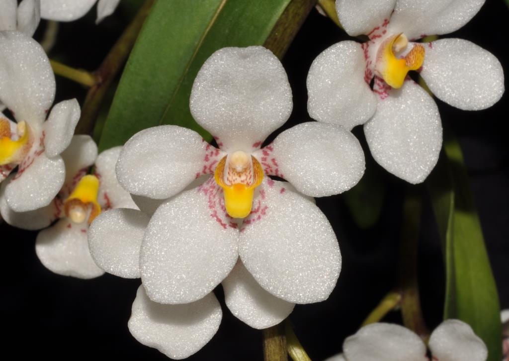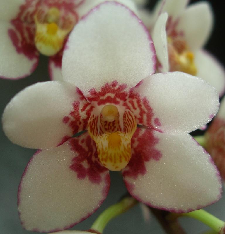 View on AOC website ↗2 inflorescences of 260mm with 20 flowers + 9 buds (10+5 relevant); petals and sepals white group 155C marked with red 46D; labellum white group 155C marked with red 46Dand yellow/orange 16A on edge.
